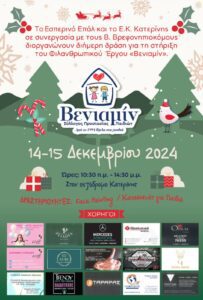 Το Εσπερινό Επάλ και το Ε.Κ Κατερίνης σε συνεργασία με τους βοηθούς Βρεφονηπιοκόμους διοργανώνουν διήμερη δράση για τη στήριξη του Φιλανθρωπικού Έργου του ΒΕΝΙΑΜΙΝ.