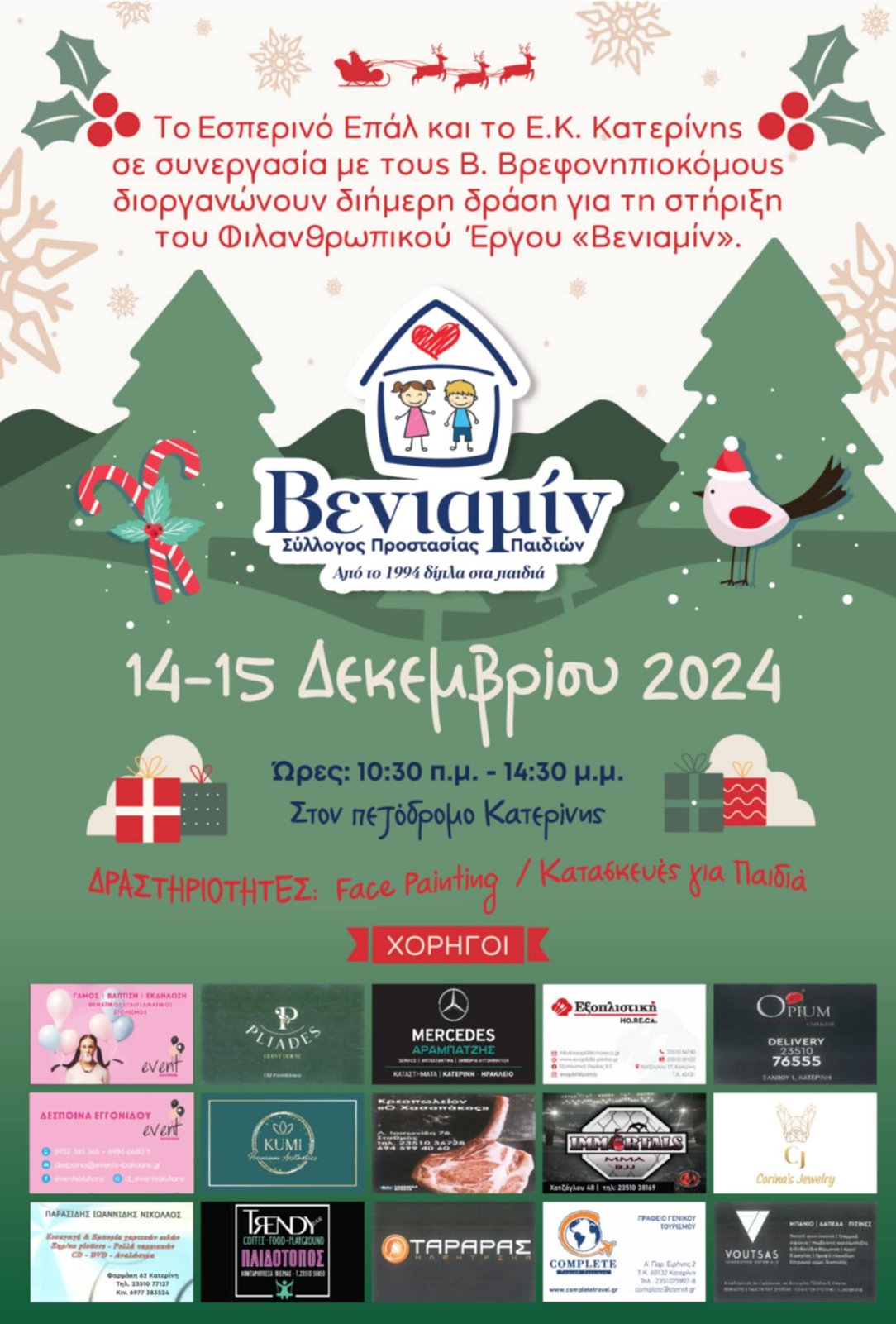 Το Εσπερινό Επάλ και το Ε.Κ Κατερίνης σε συνεργασία με τους βοηθούς Βρεφονηπιοκόμους διοργανώνουν διήμερη δράση για τη στήριξη του Φιλανθρωπικού Έργου του ΒΕΝΙΑΜΙΝ. 14-15 Δεκεμβρίου 2024 Ώρες 10:30 π.μ με 14:30 Στον πεζόδρομο Κατερίνης